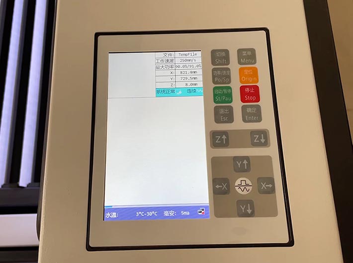 Kolejną nowością w branży jest całkowicie nowy, przeprojektowany sterownik Ruida, który wprowadza więcej powszechnie używanych funkcje, aby skrócić czas konfiguracji i zapewnić łatwość użytkowania. Teraz można nawet monitorować natężenie prądu (mA) i temperaturę wody bezpośrednio na ekranie wyświetlacza.